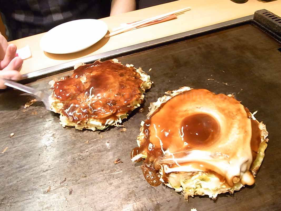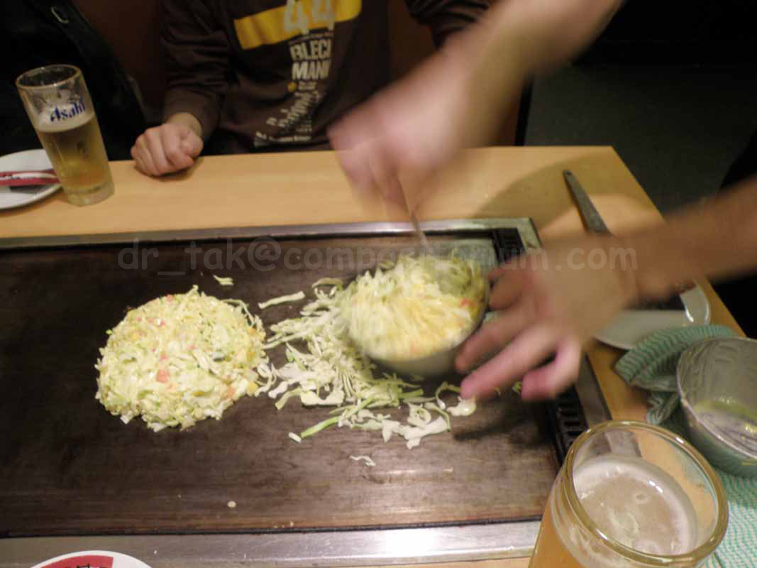 My brain: ?!?!?!?!?!?! That was quite unexpected! Apparently, Sensei ran out of ink and since he somehow knew I was in the Akiba area (Linc?), he called to ask me to pick up a color cartridge for his printer. Aye, aye Sir! Some more browsing and we decided to sit down a bit and re-energize ourselves. After running in circle in the food court of the Yodobashi Camera Building in search for a place that didn't have long lines of hungry customers, we landed at an okonomiyaki restaurant. Trying to decide which variety to choose... Vegetarian, meat, seafood...? (Picture courtesy of Luca)